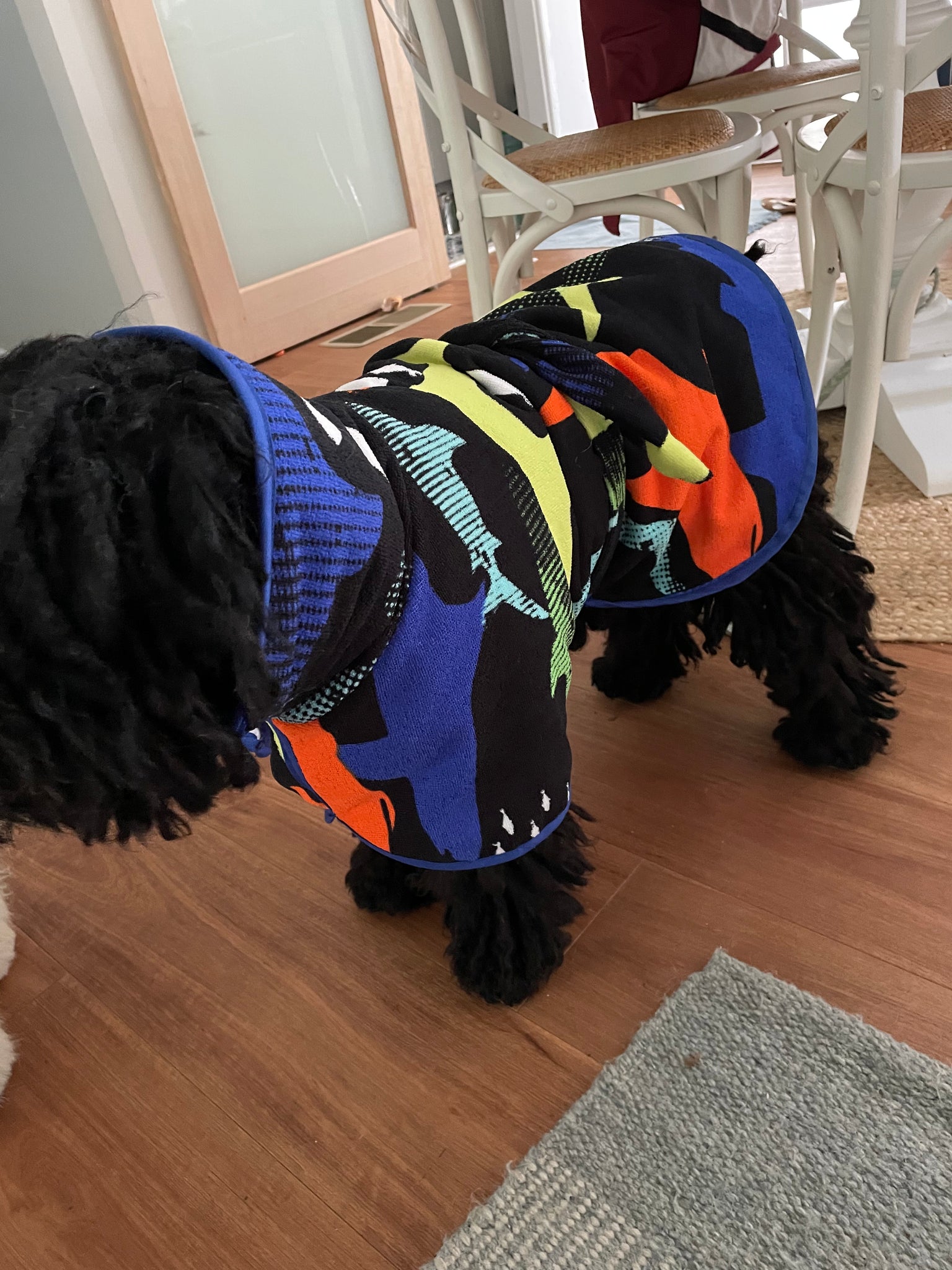Sick of a wet dog in the car, doing zoomies around the house after a wash..... We were so we created our own Robes. Depending on the seasons Charli & Molly have a large selection of fabrics to choose from, ensuring your furkid remains in fashion.